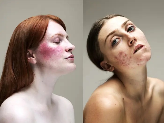 - Papulopustular rosacea: You will notice acne-like breakouts. It usually affects middle-aged women.